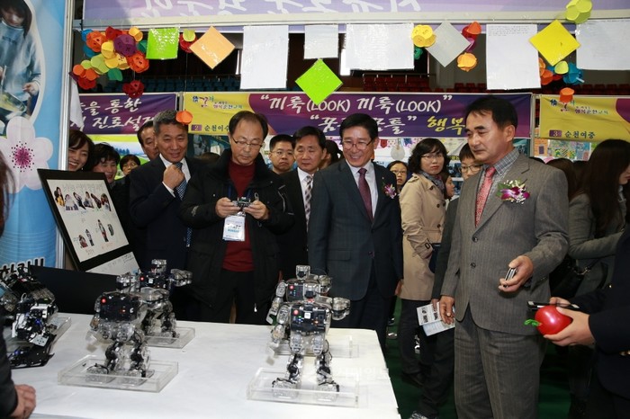 전남도순천교육지원청은 최근 순천팔마체육관에서 학생·학부모 등 2만여명이 참석한 가운데 '순천형 자유학기제 성과보고회'를 개최했다. 사진은 행사에 참석한 선태무 전남도 부교육감(가운데)과 신경수 순천교육장(오른쪽)의 모습.(사진제공=전남도교육청)