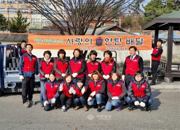 경북 구미시 광평동 하나님의 교회에서는 최근 신도 20명과 함께 저소득가구에 연탄 300장을 전달했다. 사진은 행사에 참여한 관계자들이 기념촬영을 하는 모습.(사진제공=구미시청)