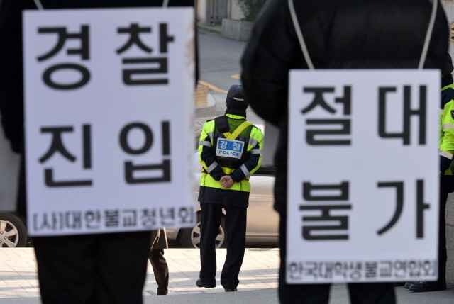 1일 오전 서울 종구로 조계사 입구에서 대한불교청년회 회원들이 한상균 민주노총 위원장 체포를 위해 경찰이 경내로 진입하는 것을 반대하는 피켓을 들고 있다.
