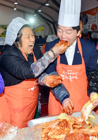 새정치민주연합 안철수 전 공동대표가 1일 오전 광주 남구 임암동 광주김치타운에서 김장을 한 뒤 김치를 맛보고 있다.