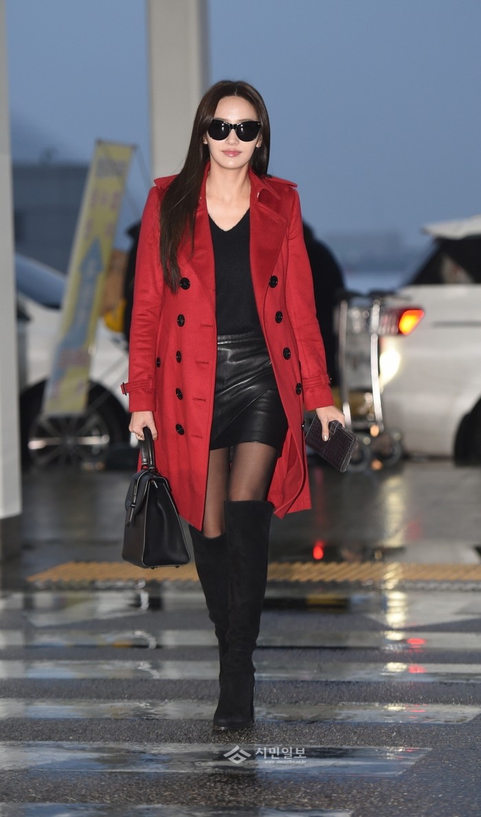 8등신의 늘씬한 몸매가 돋보이는 한채영은 티셔츠, 미니 스커트, 롱부츠를 모두 블랙으로 연출한 후, 고급스러운 컬러와 슬림핏이 돋보이는 레드 컬러의 버버리 캐시미어 트렌치 코트로 포인트를 줘 비 오는 어두운 아침을 환하게 밝히는 스타일링을 선보였다.