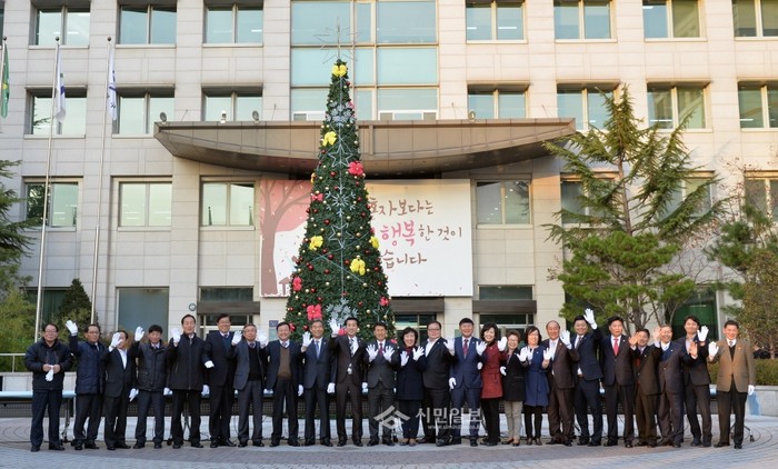 서울 동대문구가 지난 1일 '크리스마스 트리 점등식'을 진행한 가운데 구청 광장에 크리스마스 상징으로 세워진 대형 트리 앞에서 구 간부, 의원 등 관계자들이 기념촬영하고 있다.(사진제공=동대문구청)