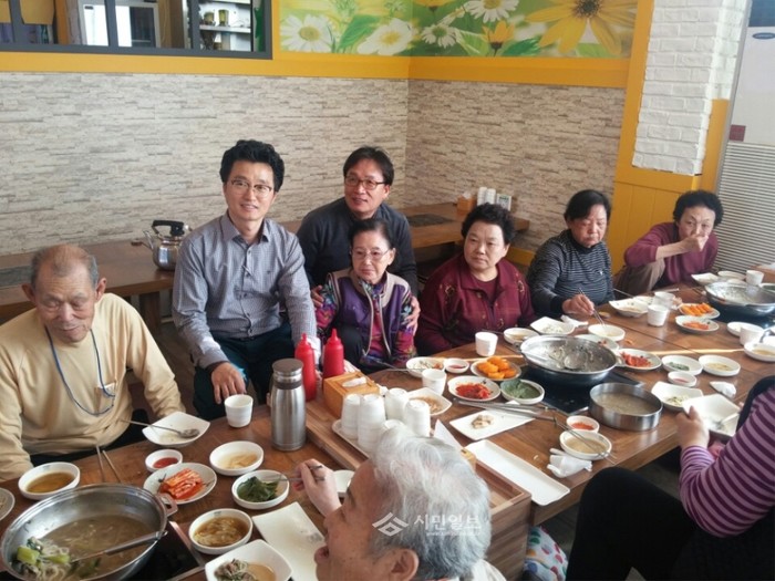 경기 수원시 팔달구 화서2동에서는 지난 1일 지역내 소재 음식점 채상궁에서 노인들에게 맛있는 음식을 대접하는 행사를 열었다. 사진은 행사에 참석한 노인들이 식사를 하는 모습.(사진제공=팔달구청)