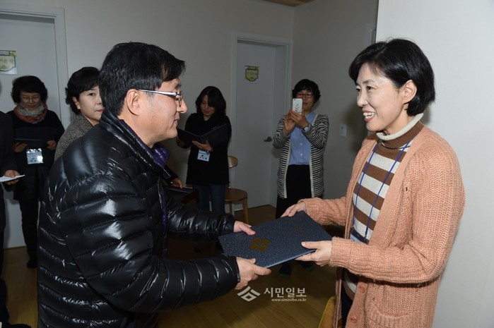 서울 노원구가 지난 2일 오전 11시 월계동 영축산 숲속의 집에서 ‘2015 마을지원활동가 양성과정 교육 수료식’을 개최한 가운데 김성환 노원구청장(왼쪽)이 마을지원활동가 양성과정 교육 이수자에게 수료증을 전달하고 있다.(사진제공=노원구청)