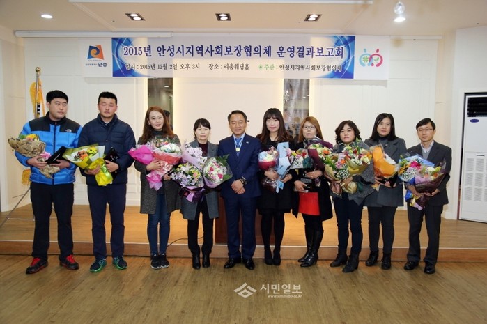 경기 안성시는 지난 2일 리움웨딩홀에서 ‘2015년 안성시지역사회보장협의체 운영결과보고회’를 진행했다. 사진은 보고회에 참석한 황은성 안성시장(가운데)과 관계자들이 기념촬영을 하는 모습.(사진제공=안성시청)