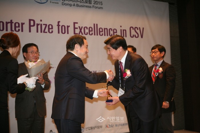 지난 2일 강동구가 쉐라톤 그랜드 호텔에서 열린 ‘제2회 Poter Prize for Excellence in CSV(Creating Shared Value·공유가치창출)’ 시상식에서 프로세스 공공부문을 수상한 가운데 이해식 구청장(오른쪽)이 트로피를 받고 있다.(사진제공=강동구청)