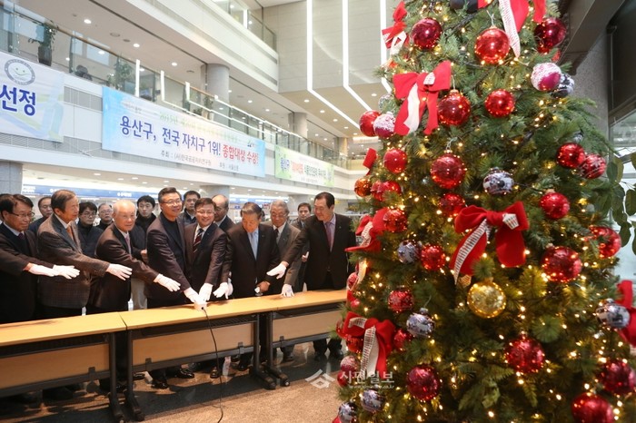 지난 2일 용산구청 2층 민원실에 크리스마스 트리가 설치된 가운데 성장현 구청장(왼쪽에서 네 번째)과 공무원들이 '크리스마스 트리 점등행사'에 참석해 점등 버튼을 누르고 있다.(사진제공=용산구청)