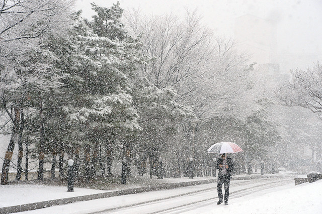서울지방에 올 겨울들어 첫 대설주의보가 내려진 3일 오전 서울 용산구 효창동 효창공원옆 폭설이 내리고 있는 거리를 한 시민이 우산을 쓰고 걷고 있다. 재난안전대책본부는 11시 현재 시 직원과 자치구 직원 1만259명과 제설차량 1118대, 제설장비 295대를 비상 투입해 제설작업에 나선 상태다. 또 염화칼슘과 소금 등 1653t을 미끄러짐 사고가 우려되는 곳에 뿌리고 있다.