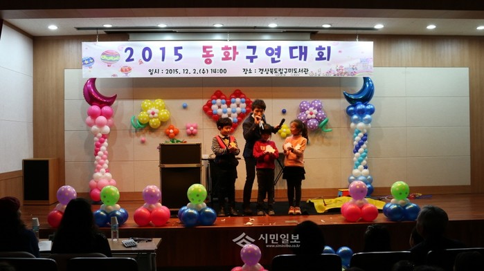 경북 구미도서관은 지난 2일 어린이들의 표현력, 발표력 신장 및 독서에 대한 흥미를 가질 수 있는 기회를 제공하고자 '2015 동화구연대회'를 개최했다. 사진은 대회에 참석한 어린이들이 공연을 진행하는 모습.(사진제공=경북도교육청)