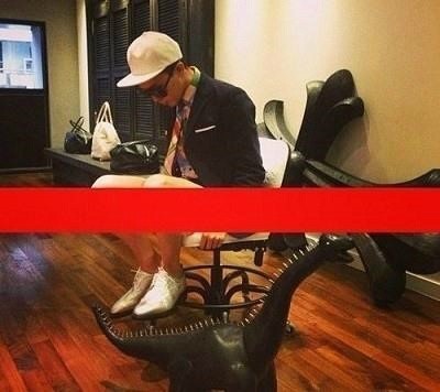 공개된 사진에서 지디는 짧은 바지를 입고 의자에 앉아 있다.