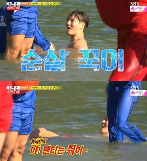 런닝맨들은 김종국에게 빼앗은 팬티를 붐 마이크에 걸면서 놀렸다. 김종국은 몸을 겨우 가리고 물속에서 나오지 못한 채 "팬티는 줘"라며 울상을 지었다.