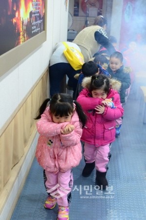 서울 영등포소방서는 지난 3일 소방서 4층 소방안전체험관에서 영일우리어린이집 보육교사와 어린이들을 대상으로 '소방안전체험교육'을 실시했다. 사진은 교육에 참가한 어린이들이 연기대피요령을 배우는 모습.(사진제공=영등포소방서)
