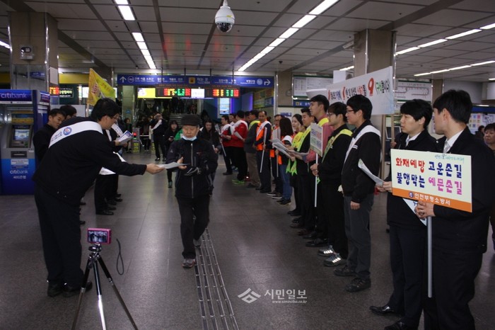 인천부평소방서는 지난 4일 동절기 화재발생 가능성이 높아짐에 따라 인천도시철도 역사 및 지하상가, 전통시장에 대한 '범시민 안전문화 캠페인'을 실시했다. 사진은 이날 행사에 참석한 관계자들이 시민들에게 캠페인을 진행하는 모습.(사진제공=부평소방서)