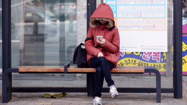 영하권 추위로 전국이 꽁꽁 얼아붙은 4일 오후 대구 중구 도심 버스정류장에서 털모자가 달린 외투를 입은 시민이 버스를 기다리고 있다.