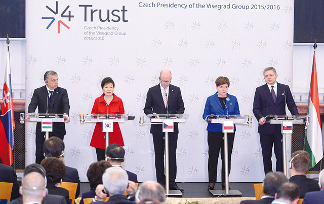 박근혜 대통령이 3일 오후(현지시간) 체코와 헝가리, 폴란드, 슬로바키아 등 중유럽 4개국 협의체인 비세그라드 그룹(V4)과의 제1차 정상회의가 열린 체코 프라하 체르닌궁(외교부)에서 공동기자회견을 있다. 빅토르 오르반(왼쪽부터) 헝가리 총리, 박근혜 대통령, 보후슬라프 소보트카 체코 총리, 베아타 쉬드워 폴란드 총리, 로베르트 피쏘 슬로바키아 총리.