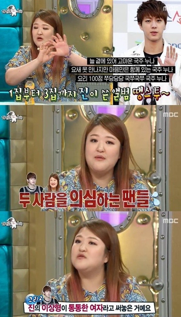 이날 이국주는 "내가 방탄소년단 진과 친한데, 게다가 하필 그 친구 이상형이 통통한 여잔데 사람들이 웃긴 게 평소엔 나보고 돼지 같다고 하더니 이럴 땐 통통으로 치더라" 라고 털어놨다.