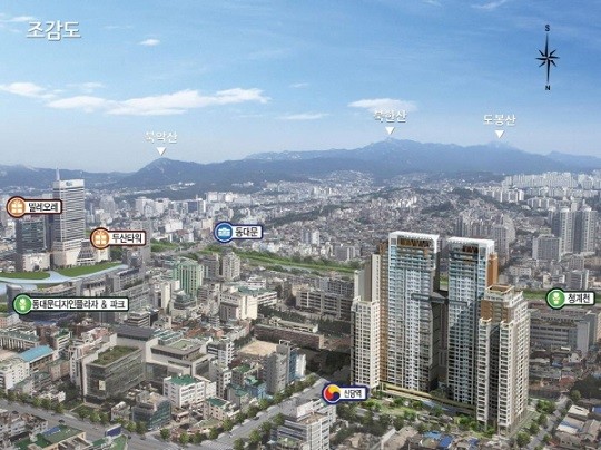 또한 청계천과 전 세대 대부분이 남산타워, 북한산, 도봉산, 청계산 조망이 가능하며, 특히 청계천이 도보 거리에 위치해 쾌적한 주거환경을 자랑한다. 또 동대문디자인파크&플라자와 동대문쇼핑몰이 15분 거리이다.