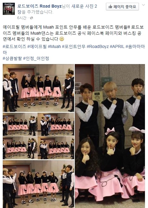 지난 6일 로드보이즈의 소속사 측은 공식 SNS를 통해 "에이프릴 멤버들에게 ‘Muah’ 포인트 안무를 배운 로드보이즈 멤버들!! 로드보이즈 멤버들의 ‘Muah’ 댄스는 로드보이즈 공식 페이스북 페이지와 버스킹 공연에서 확인하실 수 있습니다"라는 글과 함께 로드보이즈, 에이프릴의 10명의 멤버들이 함께한 인증샷을 선보였다.