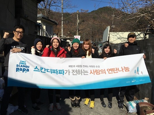 | ▲ 지난 5일 스칸디파파 임직원들이 ‘사랑의 연탄나눔 봉사활동’에 참석해 밝게 웃고 있다 | ||