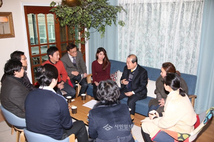 지난 4일 오후 박홍섭 서울 마포구청장(소파 가운데)이 연남동 소재의 한 게스트하우스를 방문해 외국인관광도시민박업주 5명 및 관계 직원 등과 관련 업계의 동향 파악 및 외국인 관광객 유치 활성화를 위한 지원책에 대해 이야기를 나누고 있다. (사진제공=마포구청)