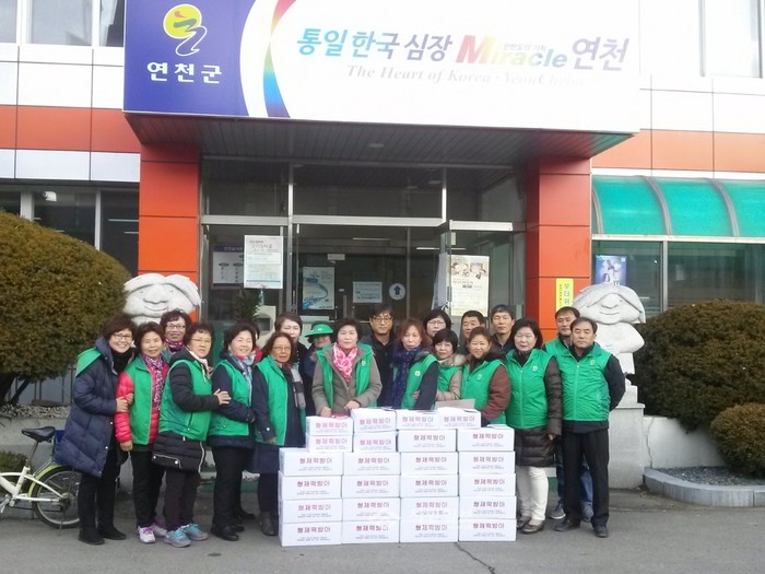 경기 연천군 연천읍 남녀새마을지도자협의회가 최근 가래떡을 만들어 17개리 경로당에 전달했다. 사진은 행사에 참석한 협의회 관계자들이 기념촬영을 하는 모습.(사진제공=연천군청)