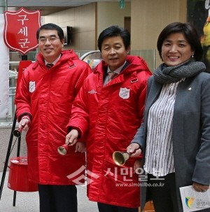 경기 광명시는 오는 31일까지 광명사거리와 철산역 등 2곳에서 '2015 자선냄비'를 운영한다. 사진은 7일 시청 본관 로비에서 양기대 시장(왼쪽), 나상성 광명시의장(가운데), 고순희 시의원 등이 참석한 가운데 '2015 자선냄비 시종식'이 진행되는 모습.(광명=류만옥 기자)