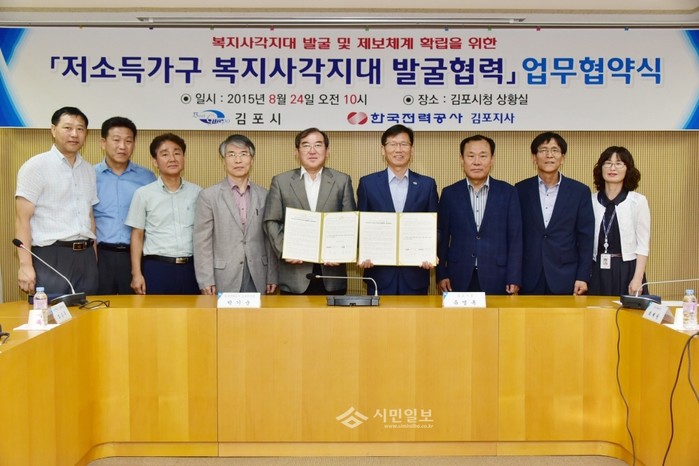 | ▲ 경기 김포시와 한국전력공사 김포지사가 '저소득가구 복지사각지대 발굴협력'을 위한 업무협약을 체결했다. 사진은 업무협약식에 참석한 유영록 김포시장(오른쪽 네 번째)과 양 기관 관계자들의 기념촬영 모습. | ||