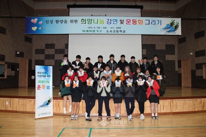 경기 부천시 소사고등학교는 7~8일 미래희망기구와 함께 교내 체육관에서 아프리카 아이들에게 운동화를 전달하기 위한 '희망나눔 운동화 그리기' 행사를 진행했다. 사진은 8일 행사에 참석한 학생들이 기념촬영을 하는 모습.(사진제공=부천교육지원청)