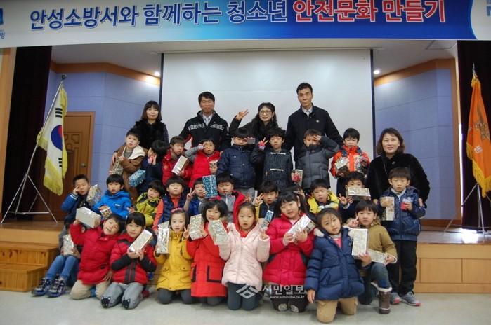 경기 안성소방서는 8일 겨울철 청소년 안전문화 활성화 시책의 일환으로 안성소방서를 방문한 지역내 어린이집 원생 40여명과 함께 '안전문화교실'을 진행했다. 사진은 교육에 참석한 어린이들이 기념촬영을 하는 모습.(사진제공=안성소방서)