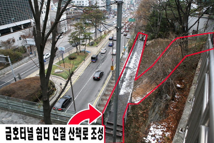 8일 구의회에 따르면 금호터널 쉼터 연결 산책로는 신당동 309-62번지 일대로서 금호터널 쉼터에서 동호경로당까지 연결되는 46m에 이르는 길이다.
