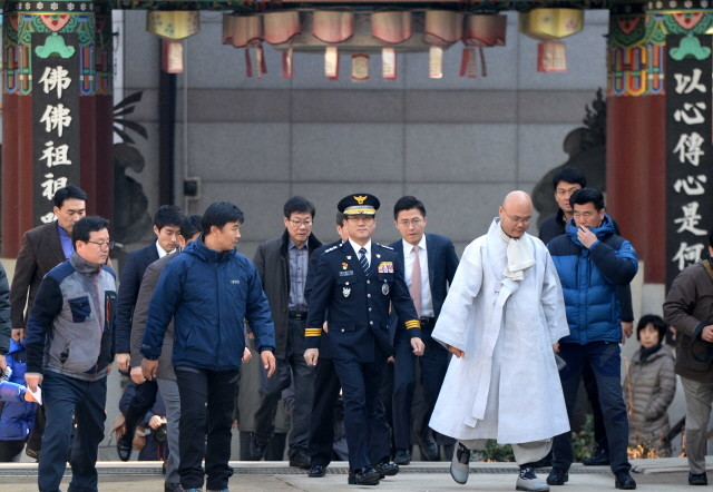 구은수 서울경찰청장이 8일 한상균 민주노총 위원장이 피신 중인 서울 종로구 조계사 대웅전 방문을 위해 들어서고 있다.