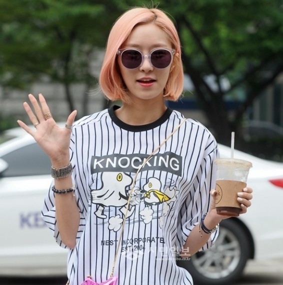이 날 가은은 귀여운 프린트가 된 티셔츠를 입고 선글라스를 낀채 출근을 하고 있다.