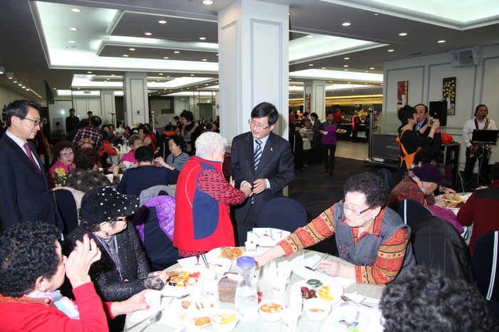 서울 노원구가 지난 7일 오전 11시 중계동내 연회장에서 ‘온(溫)사랑 나눔축제’를 개최해 김성환 노원구청장(가운데)이 축제에 참석해 초청된 노인들에게 인사를 전하고 있다.(사진제공=노원구청)