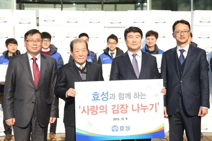 지난 8일 서울 마포구는 구청 앞에서 1만5000kg의 김장김치를 어려운 이웃에게 기부하는 '효성과 함께하는 사랑의 김장 나누기' 행사를 진행했다. 사진은 박홍섭 구청장(왼쪽에서 두 번째)이 효성그룹 관계자들과 전달식을 진행하는 모습.(사진제공=마포구청)