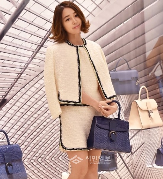 이 날 이민정은 샤넬스타일의 투피스를 입고 카메라를 응시하고 있다.