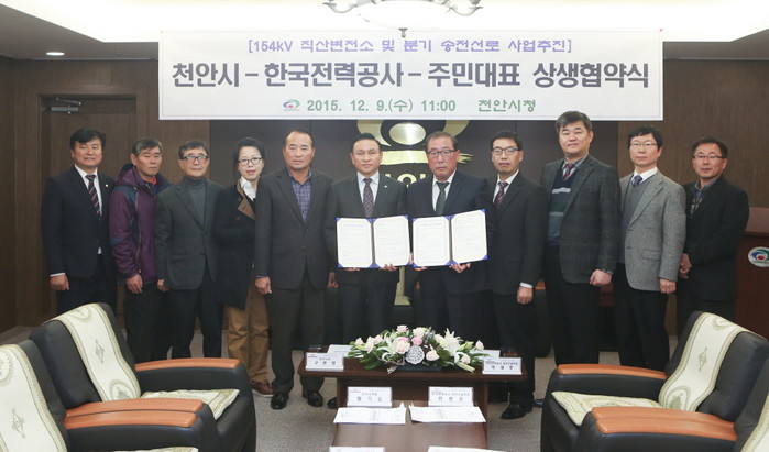 [시민일보=여영준 기자]한국전력(사장 조환익)은 지난 9일 오전 11시 천안시청에서 구본영 천안시장, 직산읍 주민대표와 '지역주민-천안시-한전 간 154kV 직산변전소 및 관련 송전선로 건설공사 상생협력 MOU'를 체결했다.