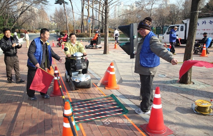 지난 8일 영등포공원에서 진행된 '전동 휠체어·스쿠터 안전교육'에 참여한 조길형 영등포구청장이 지도자들의 신호에 따라 장애물을 피해 전동 스쿠터를 타고 있다.(사진제공=영등포구청)