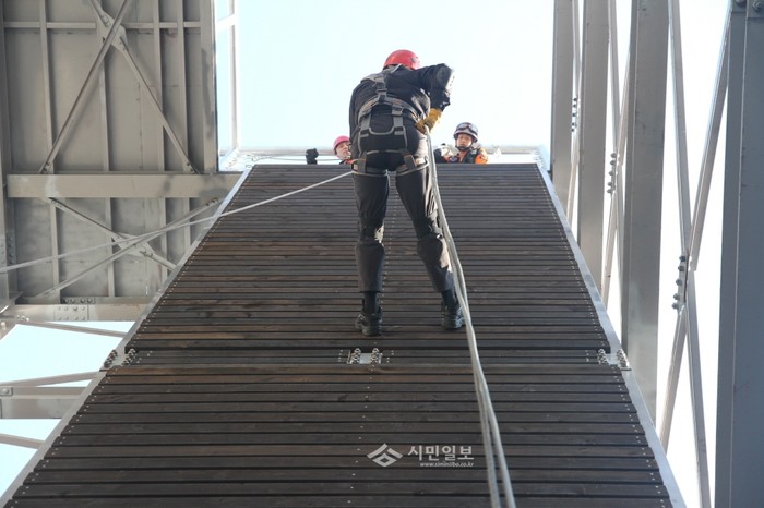 은평소방서는 지난 8일 소방서 훈련탑에서 겨울철 고드름 제거를 위한 '고소작업 훈련'을 실시했다. 사진은 이날 소방서 관계자가 훈련을 진행 중인 모습.(사진제공=은평소방서)