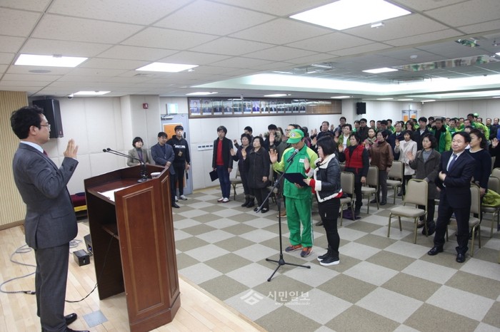 경기 수원시 팔달구는 지난 8일 구청 대회의실에서 '2016 수원화성 방문의 해' 손님맞이를 위한 '올바른 쓰레기 배출 참여단 위촉 및 발대식'을 개최했다. 사진은 행사에 참석한 박흥식 구청장(왼쪽)과 관계자들이 선서를 하는 모습.(사진제공=팔달구청)