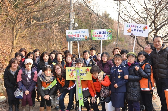 서울 서대문소방서 의용소방대원들은 지난 9일 서대문구 안산자락길 일대에서 '겨울철 산불조심 캠페인'을 실시했다. 사진은 캠페인에 참가한 관계자들이 기념촬영을 하는 모습.(사진제공=서대문소방서)