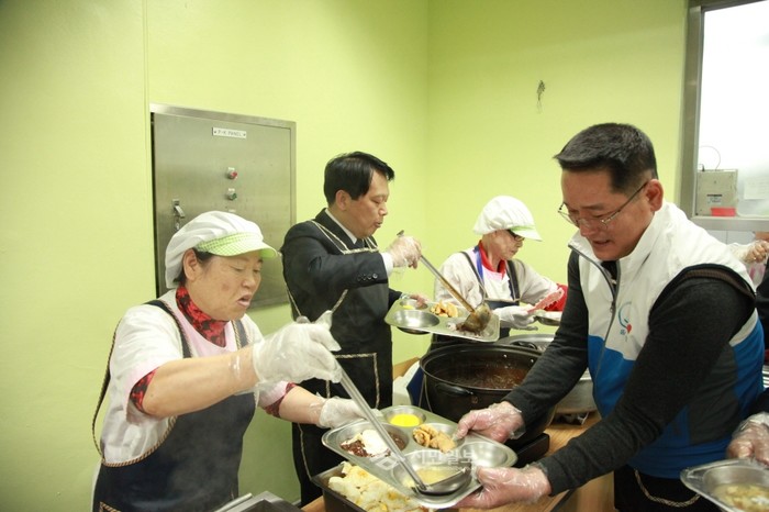 지난 7일 서울 구로구 화원종합사회복지관 로비에서 실시된 ‘사랑의 자장면 봉사’에 참가한 이성 구청장(가운데)이 저소득층 노인들에게 배식 봉사를 하고 있다.(사진제공=구로구청)