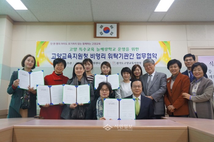 경기도 고양교육지원청 고양특수교육지원센터는 지난 9일 교양교육지원청에서 2015학년도 겨울방학 늘해랑학교 운영 위탁기관 업무 협약식을 진행했다. 사진은 심학경 교육장을 비롯한 관계자들이 기념촬영을 하는 모습.(사진제공=고양교육지원청)
