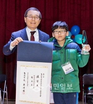 경북 구미시는 지난 9일 오후 2시 지산초등학교 다목적 강당 및 교실에서 '2015 구미시 초등학생 한자왕(漢字王) 선발대회'를 개최했다. 사진은 남유진 시장과 한자왕에 선정된 지산초등학교 4학년 정은혁 학생이 기념촬영을 하는 모습.(사진제공=구미시청)