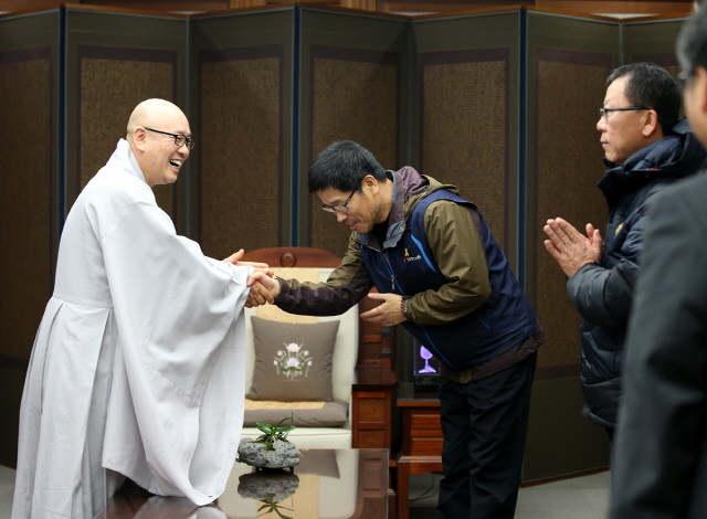 10일 오전 한상균 민주노총위원장이 은신하던 서울 종로구 조계사에서 자진 퇴거를 결정하고 대웅전에서 참배를 하고 자승 총무원장을 비롯한 조계사 관계자들을 만나고 있다.