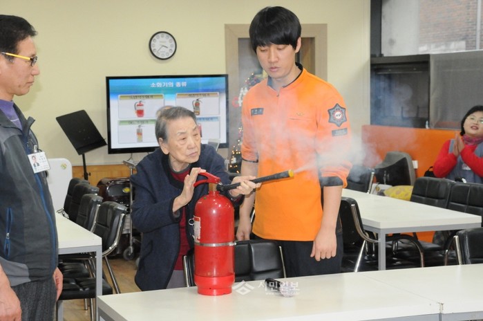서대문소방서는 지난 10일 '홍광데이케어센터' 직원 및 노인들 대상으로 '소방안전교육'을 실시했다. 사진은 교육에 참석한 노인이 소화기 사용 실습을 하는 모습.(사진제공=서대문소방서)