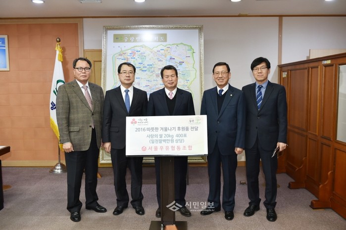 지난 10일 나진구 서울 중랑구청장(가운데)이 송용헌 서울우유협동조합장(왼쪽에서 네 번째)으로부터 1800만원 상당의 사랑의 쌀 400포를 전달받고 기념촬영을 하고 있다.(사진제공=중랑구청)