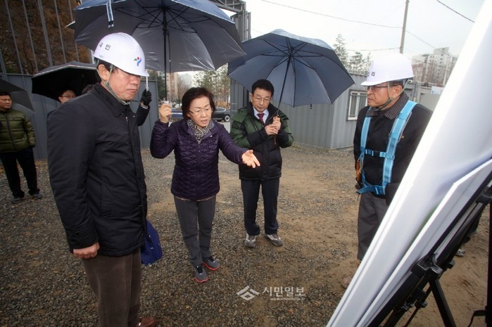 신연희 서울 강남구청장(왼쪽에서 두 번째)이 지난 10일 오전 11시 강남구 신사동에 건설 중인 신사 빗물 펌프장의 공사 현장을 방문해 진행 상황을 점검하고 있다.(사진제공=강남구청)