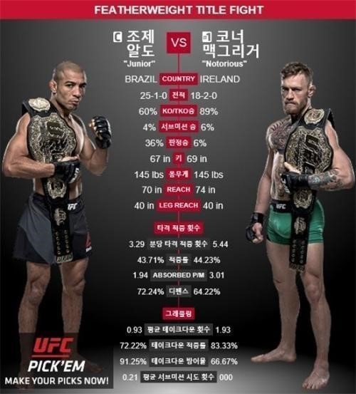 알도에 맞서는 맥그리거는 압도적인 타격 능력으로 14연승을 기록 중이다. 지금까지 알도가 만난 상대들 중에서 단연 압도적인 성적이다.