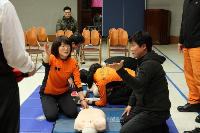 서울 동작소방서는 지난 11일 오후 2시 소방서 3층 강당에서 학원 관계자 20여명을 대상으로 심폐소생술 교육을 진행했다. 사진은 간담회에 참석한 관계자들이 심폐소생술 체험을 하는 모습.(사진제공=동작소방서)
