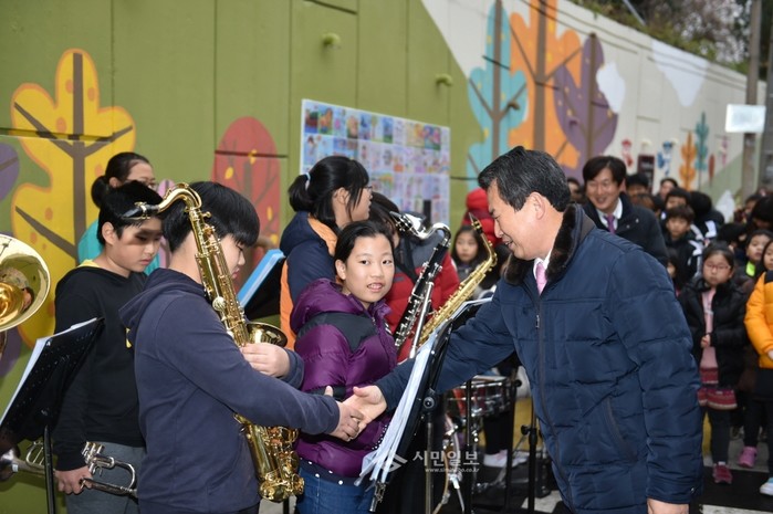 중랑구는 최근 '상봉1동 안심체마을' 안전마을 만들기 벽화 개방식을 진행했다. 사진은 행사에 참석한 나진구 구청장이 상봉초등학교 학생들과 악수를 하는 모습.(사진제공=중랑구청)